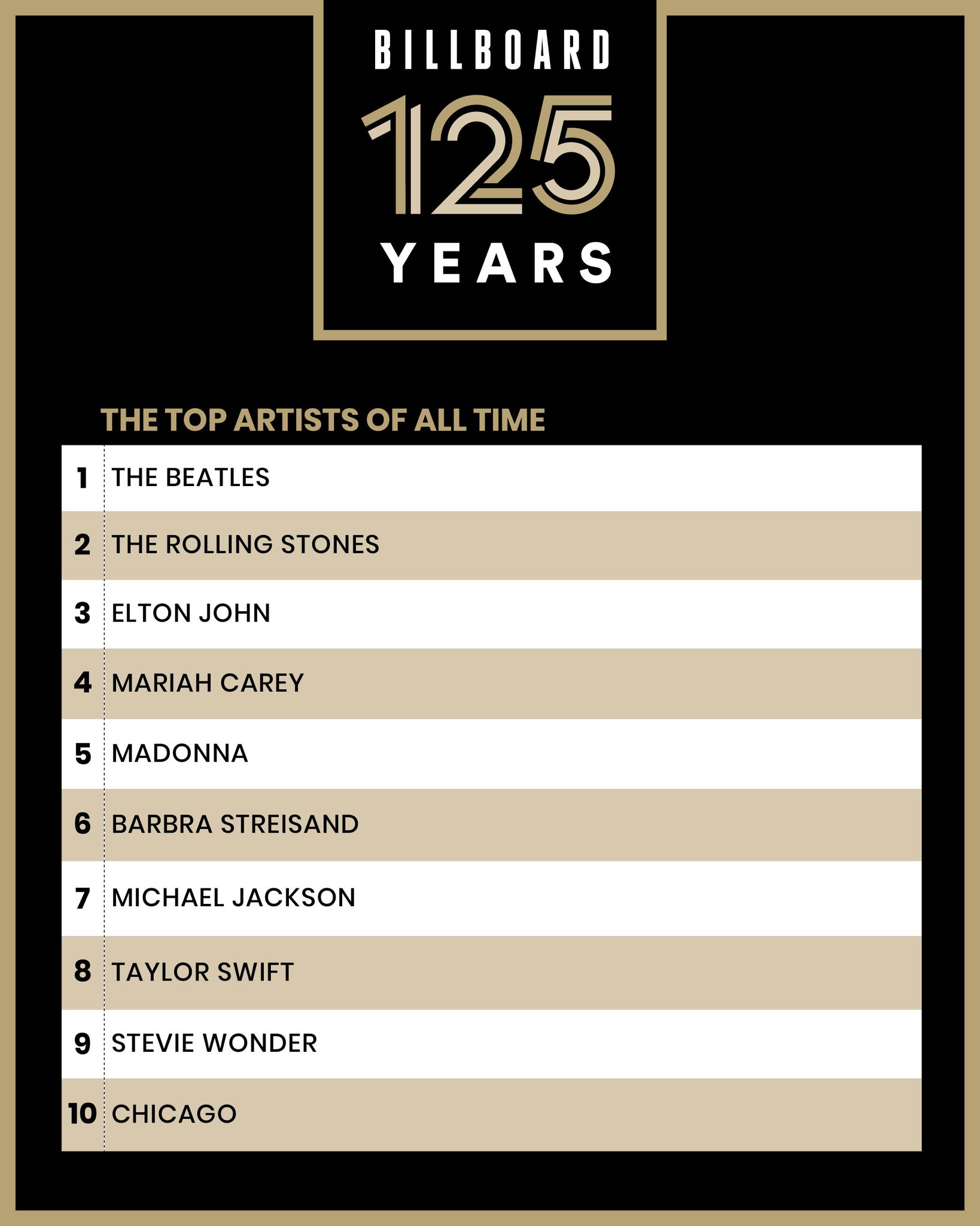 The Beatles Madonna Elton John Elvis Presley Mariah Carey Stevie Wonder Janet Jackson Michael Jackson Whitney Houston Rihanna. Billboard notes that Drake was really close to also making the top 10 as he ranks No. The Rolling Stones claim the No.